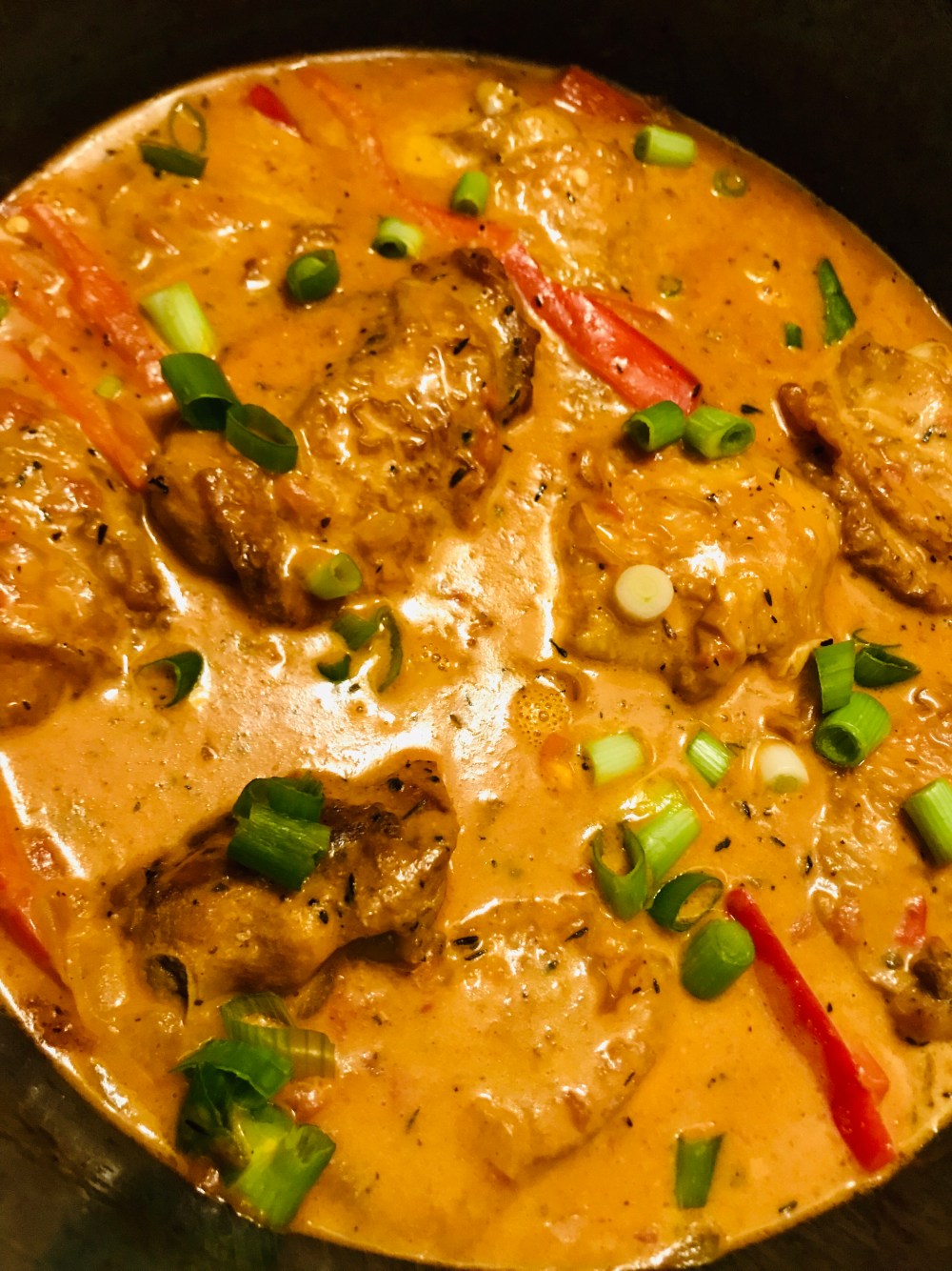 Reduce to medium-low heat and add in the grilled chicken pieces along with the bell pepper and cook for about 2 minutes to allow all the flavours to come together. If too thick add a little bit of water to loosen the consistency of the sauce. Check for seasoning to your taste.
