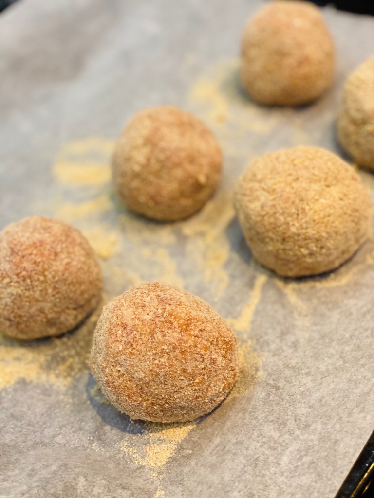 - Completely cover the eggs in bread crumbs and lay on a lined baking tray and set aside.