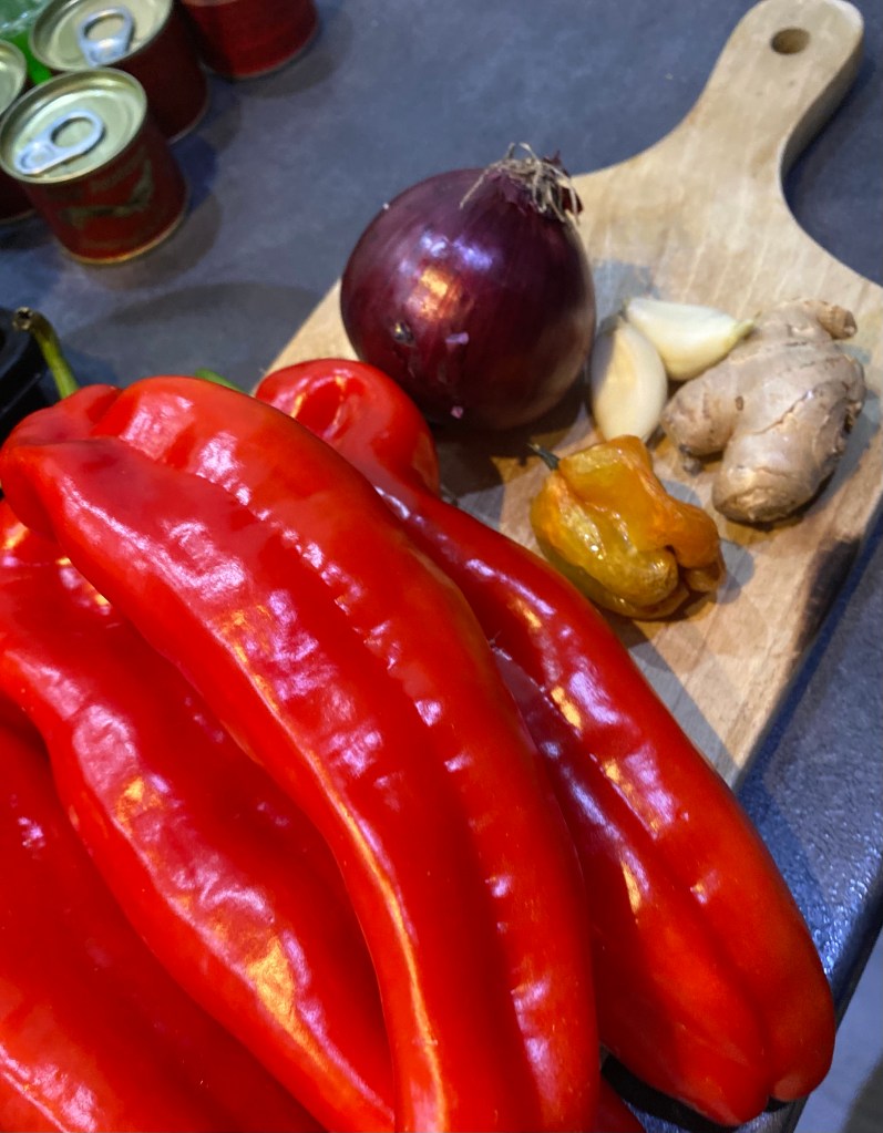 - Blend the paprika peppers, onion, ginger, garlic and habanero pepper together with 1/2 cup of water, boil the pepper mix up until all the water evaporates and set aside.