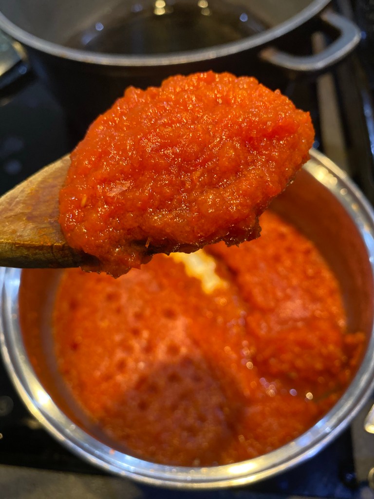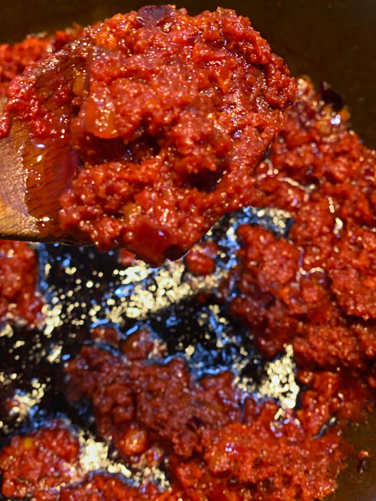 - Once translucent, add the tomato paste and fry over medium-low heat for 15 mins or until it develops a dark rich colour and loses its sour taste.